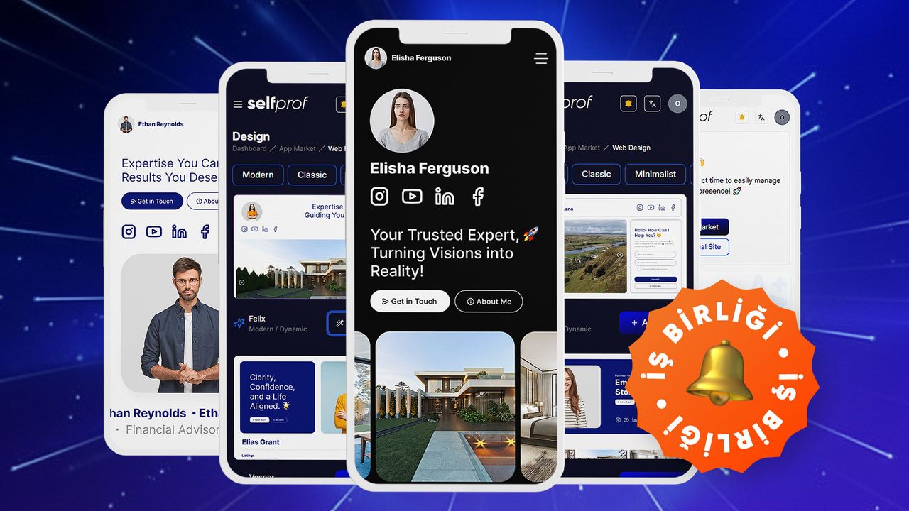 Artık dijital varlığınızı oluşturmak için doğru zaman. Selfprof ile sosyal medyada hesap açmak kadar kolay bir şekilde profesyonel kişisel sitenizi oluşturun, portföyünüzü sergileyin ve daha fazla müşteriye ulaşın. Çünkü başarılı bir gayrimenkul kariyeri, güçlü bir dijital kimlikle başlar.