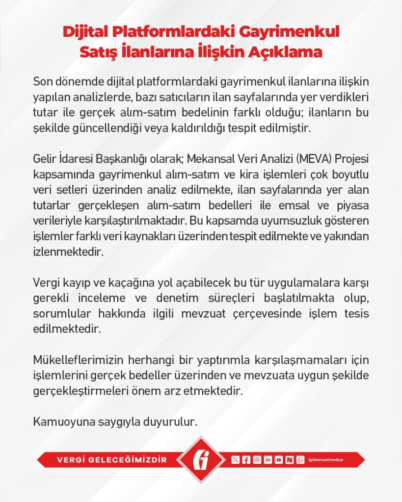 GİB, ilanlardaki bedel oyunlarının vergi kaybına yol açtığına dikkat çekerek şu uyarılarda bulundu: