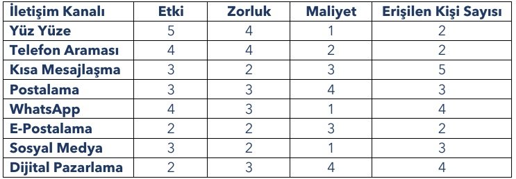 Bu matriste söz konusu iletişim kanalları, etki seviyesi, zorluk düzeyi, maliyet, erişilen kişi sayısı başlıklarında 1 en düşük, 5 en yüksek olacak şekilde 1’den 5’e kadar değerlendirilecektir.