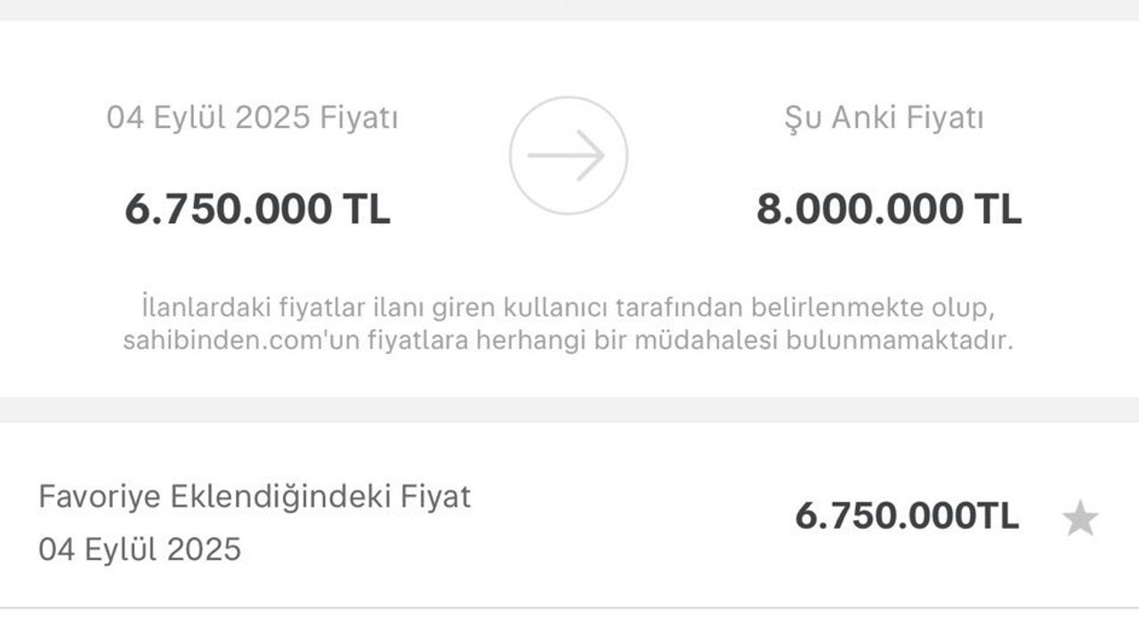 Bakanlıktan yapılan açıklamaya göre, söz konusu ilan 1 Eylül 2025 tarihinde 6.750.000 TL’den yayınlanırken, 2 Ekim 2025 tarihinde fiyatın 8 milyon TL’ye güncellendiği belirlendi. Bu artışın genel ekonomik verilerle uyumlu olmadığı değerlendirilerek, ilanı veren bireysel kullanıcıya 100.000 TL idari para cezası uygulandı.